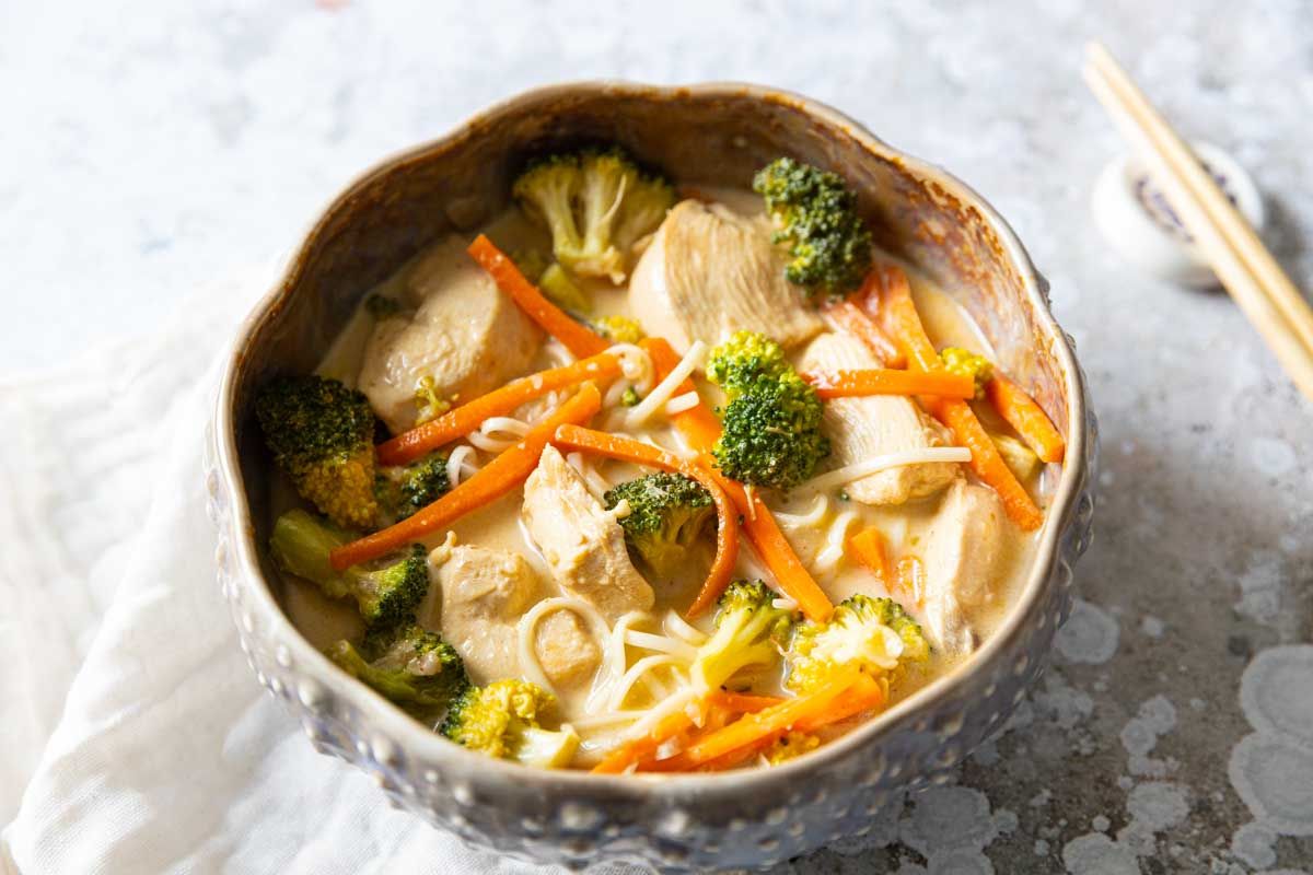 Ces nouilles japonaises, accompagnées de poulet tendre, de légumes frais et d'une crème de coco onctueuse, sont un véritable délice pour les papilles.