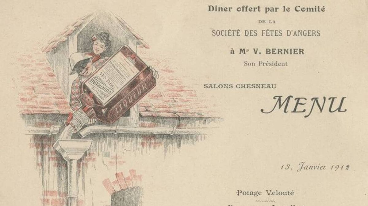 Parmi les membres du comité d’honneur de la société, on retrouve l'industriel Édouard Cointreau. Ce détail est non seulement corroboré par le menu, mais également par une illustration captivante mettant en scène une jeune femme versant généreusement Cointreau dans une gouttière qui alimente un pierrot, une figure emblématique créée par Tamagno pour représenter cette liqueur célèbre. Cette scène évocatrice donne l'impression que le pierrot est submergé dans un océan de Cointreau, soulignant l'importance de ce produit local dans la culture angevine. Pour le dessert, le triple sec proposé par Cointreau faisait également partie du festin.